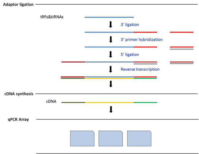 由于tRF & tiRNA片段很短,且序列与其前体tRNA十分相似,常规的引物设计难以完全区分二者。为了保证最佳的特异性,Arraystar创新性的采用双端接头法,在tRF & tiRNA的3’和5’端分别引入了一段人工合成序列,并针对跨连接点区域设计引物,从而取得唯一性的PCR扩增产物(图1)。另外,每一步qPCR流程都经过了精心优化和严格测试。每块板都设置了Spike-in对照、PCR阳性对照、基因组DNA对照和看家内参对照,确保了最高的数据质量。