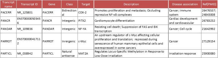7SK, AA174084, AB073614, ABHD11-AS1, ACTA2-AS1, ADAMTS9-AS2, AF339813, AFAP1-AS1, AIRN-1, AIRN-2, AK095147, AP5M1, APOC1P1, ARA-1, ARA-2, ATG9B-1, ATG9B-2, BANCR, BCAR4-1, BCAR4-2, BGLT3, BLACAT1, BOK-AS1, C5orf66-AS1, CASC11-1, CASC11-2, CASC2-1, CASC2-2, CASC9, CBR3-AS1-1, CBR3-AS1-2, CCAT1, CCAT2, CCDC26, CCEPR, CRNDE, CTB-89H12.4, CTBP1-AS, DLEU1-1, DLEU1-2, DNM3OS-1, DNM3OS-2, DRAIC (LOC145837), DSCAM-AS1-1, DSCAM-AS1-2, EGFR-AS1, EGOT, ENST00000434223, ENST00000456816, ENST00000480739, EPB41L4A-AS1, EPB41L4A-AS2, EWSAT1, FALEC, FAS-AS1 (SAF), FER1L4, FEZF1-AS1, FGF14-AS2, FLG-AS1-1, FLG-AS1-2, FOXCUT, FTX, GACAT1-1, GACAT1-2, GACAT2, GACAT3, GAPLINC-1, GAPLINC-2, GAS5, GAS8-AS1, GATA6-AS1, GHET1, H19-1, H19-2, HAGLR, HAND2-AS1, HCP5, HIF1A-AS1, HIF1A-AS2, HNF1A-AS1, HOTAIR-1, HOTAIR-2, HOTAIR-3, HOTAIRM1-2, HOTTIP, HOXA-AS2 , HULC, KCNQ1OT1, KRASP1, KRT18P55, KRT7-AS, L1PA16, LINC00032, LINC00152-1, LINC00152-2, LINC00152-3, LINC00312, LINC00467, LINC00473, LINC00668, LINC00673, LINC00857, LINC00901 , LINC00951, Linc00963, LINC00970, LINC01133, LINC01315-1, LINC01315-2, LINC01630-1, LINC01630-2, LINC-PINT, Linc-POU3F3-1, Linc-POU3F3-2, lincRNA-p21, lincRNA-RoR, lncRNA-CTD903, lncRNA-HEIH, LOC100130476, LOC100507661 , LOC101054525 , LOC389332, LSINCT5, LUCAT1, LUNAR1, LUST, MACROD2-AS1-1, MACROD2-AS1-2, MEG3-1, MEG3-2, MER11C, MIAT, MINA, MIR100HG, MIR155HG, MIR17HG, MIR31HG, MT1JP, MYCNOS-1, MYCNOS-2, MYCNUT, NAMA-1, NAMA-2, NBAT-1, NDM29, NEAT1-1, NEAT1-2, NKILA, NPTN-IT1, OR3A4P, ORAOV1, PACERR, PANDAR, PARROT, PAX8-AS1-1, PAX8-AS1-2, PCA3-1, PCA3-2, PCAT-1, PCAT18, PCAT29, PCAT6-1, PCAT6-2, PCBP2-OT1, PCGEM1, PGM5-AS1-1, PGM5-AS1-2, PICSAR, PINC, POU6F2-AS2, PRNCR1, PSF inhibiting RNA, PTCSC1, PTCSC3, PTENP1, RGMB-AS1, RMEL3, RUNX1-IT1, SAMMSON , SBF2-AS1, SCHLAP1, SNHG1, SNHG15, SNHG16, SNHG20, SNHG5, SOX2OT, ST7-AS1, ST7-AS2-1, ST7-AS2-2, ST7-OT3, ST7-OT4, SUMO1P3, TARID, TCL6, TDRG1, TERC, TIE1-AS, TRERNA1, TRIM52-AS1-1, TRIM52-AS1-2, TUG1-1, TUG1-2, TUSC7 , TUSC8, U79277, uc.338, uc.73A(P), UCA1, UFC1 lincRNA , VLDLR-AS1, WSPAR, WT1-AS-1, WT1-AS-2, WT1-AS-3, X91348, Yiya, ZEB2-AS1, ZFAS1-1, ZNF582-AS1-1, ZNF582-AS1-2, ZNF582-AS1-3