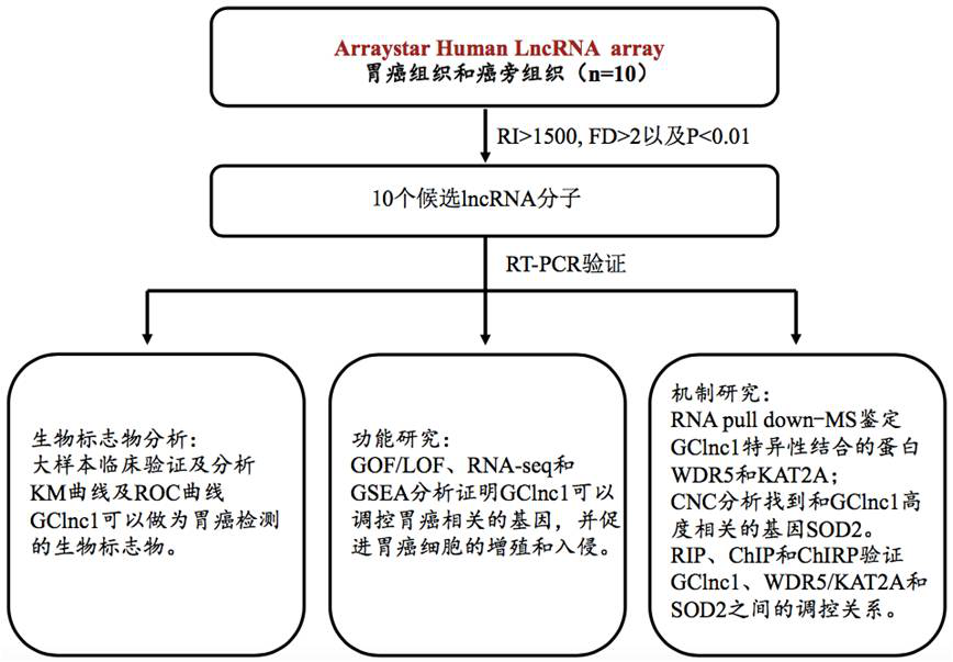 本研究借助美国Arraystar公司的human lncRNA array在胃癌中筛选到大量异常表达的lncRNA,临床分析发现lncRNA GClnc1可以做为预测胃癌发生的生物标志物。接着,作者还做了大量的生信分析和功能实验来探究GClnc1是如何促进胃癌发生和开展的。总之,GClnc1可以做为治疗胃癌的一个潜在靶点;并且本研究的芯片数据对胃癌的诊断和治疗,以及探究非编码RNA的分子机制奠定了基础。