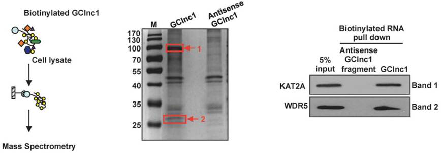 lncRNAs可以顺利获得和转录因子或者其他细胞因子结合来发挥功能。为了探究GClnc1具体的作用机制,作者利用RNA pull down实验和质谱来寻找GClnc1可能结合的蛋白。顺利获得质谱实验,作者鉴定了近200个蛋白,同时选取了其中的10个和转录调控相关的蛋白进行WB验证。结果发现,只有蛋白WDR5和KAT2A可以和GClnc1特异性结合,其中WDR5是H3K4甲基转移酶,而KAT2A是H3K9乙酰转移酶。接下来,作者利用siRNA和RIP实验进一步证明了GClnc1可以特异性和蛋白WDR5以及KAT2A结合形成复合物。