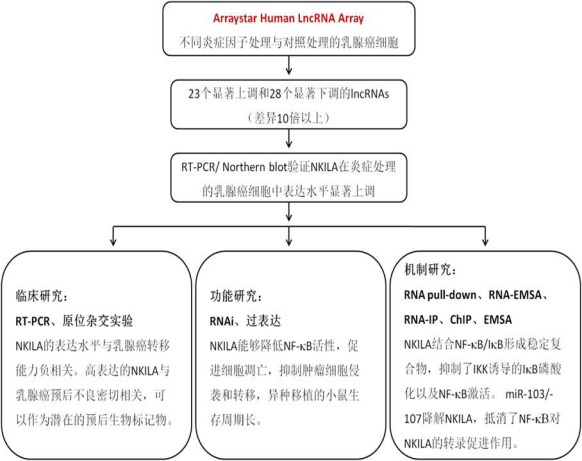 NF-kB是一个在炎症、免疫、细胞增殖和细胞分化等过程中发挥关键作用的转录因子。NF-kB是联系炎症与肿瘤的关键分子,炎症条件下,NF-kB组成性持续激活,促进肿瘤细胞侵袭和转移。lncRNAs是一类转录本长度超过200nt的RNA分子,无蛋白质编码功能。近来的研究发现,lncRNA在多个层面调控基因表达,并且能够调控肿瘤细胞增殖、凋亡、转移、代谢、衰老和抗药性。但是lncRNA在NF-kB信号通路和肿瘤相关的炎症反应中的作用尚不清楚。宋尔卫教授课题组本次研究目的在于揭示lncRNA与NF-kB信号通路及乳腺癌肿瘤转移间的关系。