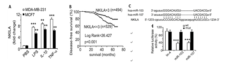 图C. 图示miR-103/-107与NKILA的结合位点,荧光素酶报告基因实验确认miR-103/-107调控NKILA表达水平;