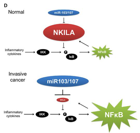 图D. 模型展示:在转移性乳腺癌中,NF-kB活性高,促进NKILA表达;而在转移性乳腺癌中高表达的miR-103/-107能够快速降解NKILA,抵消NF-kB对NKILA的促进作用。