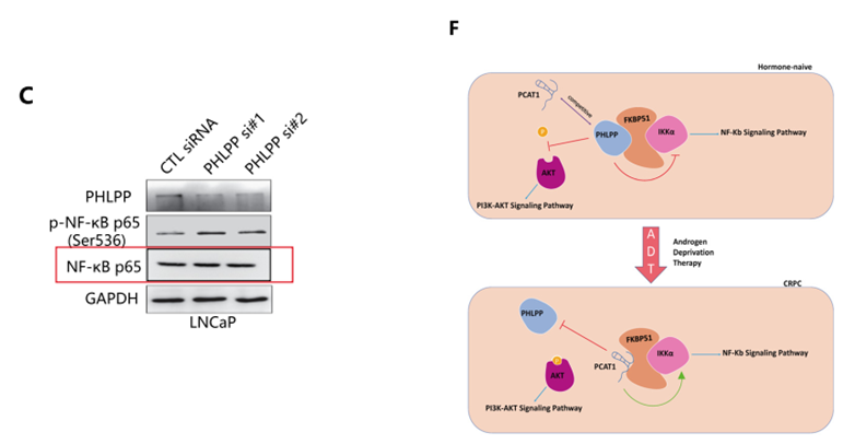 作者以预测出的PCAT1/FKBP51相互作用域和已知的FKBP51/PHLPP蛋白复合体间的相似作用区域为出发点,提出PCAT1可能顺利获得与PHLPP竞争,进而结合FKBP51的观点。接下来,作者顺利获得免疫共沉淀实验,发现在LNCaP,LNCaP-AD P30细胞中,PHLPP可与FKBP51蛋白结合,共同发挥作用,而在PCAT1表达较高的LNCaP-AI细胞中,并未检测到PHLPP与FKBP51的结合,该结果提示hjc黄金城在缺乏雄激素的情况下,PCAT1可置换PHLPP蛋白,代替其发挥作用(图A);进而在雄激素非依赖性LNCaP-AI细胞中发现,敲降PCAT1可以恢复FKBP51/PHLPP蛋白相互结合的状态,同时减弱FKBP51/ IKKα间的相互作用(图B)。PCAT1的缺失,并不影响FKBP51, PHLPP以及 IKKα的表达水平(图F),却导致磷酸化NF-κB-p65表达水平的升高(图C)。