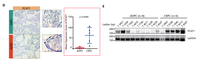 作者顺利获得检索和分析已发表文献及公共数据库发现lncRNA PCAT1基因表达上调的前列腺癌患者与其他PCAT1基因表达正常或降低的患者相比,其无复发生存率以及总生存率均更差;并且与雄激素敏感的前列腺癌患者相比,去势抵抗性前列腺癌患者中PCAT1表达更高(下图A,B,C)。之后5组雄激素敏感的前列腺癌患者和去势抵抗性前列腺癌患者的RNA原位杂交实验以及RT-PCR实验结果均证实了这一结论(下图D,E)。