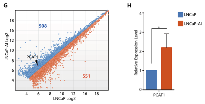 作者随后使用Arraystar Human LncRNA芯片检测了雄激素依赖性前列腺癌细胞LNCaP(n=3)和雄激素非依赖性前列腺癌细胞LNCaP-AI(n=3)中LncRNA的表达变化,发现508个上调的LncRNA和551个下调的LncRNA(FC>2,P<0.05),其中,PCAT1在LNCaP-AI细胞中显著上调(FC>2),PCR验证与芯片结果一致(下图G,H)。