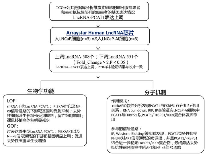 作者运用Arraystar Human LncRNA芯片检测了雄激素依赖性前列腺癌细胞(LNCaP)和雄激素非依赖性前列腺癌细胞(LNCaP-AI)中LncRNA的表达变化,发现PCAT1在LNCaP-AI细胞中显著上调。Western Blotting结果发现LncRNA-PCAT1能激活去势抵抗性前列腺癌(castration-resistant prostate cancer, CRPC)中的AKT和NF-κB信号通路。RNA pull down ,RIP等实验表明LncRNA PCAT1与 FKBP51存在相互作用的关系,接下作者顺利获得一系列实验证实LncRNA-PCAT1以PCAT1-FKPB51-IKKα复合体的形式发挥作用,并激活CRPC中的AKT和NF-κB信号通路。最后作者顺利获得体外细胞GOF和LOF功能实验以及体内实验,证实了敲降LncRNA-PCAT1可以抑制去CRPC的生长。作者的研究为CRPC的潜在生物标志物以及潜在治疗靶点给予了有价值的研究思路。该研究发表在Nucleic Acids Research(IF=11.56)上。(芯片实验由hjc黄金城生物给予技术服务
