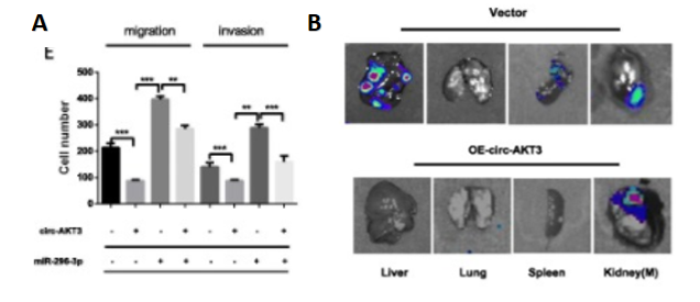 RNA pull down, Ago-RIP等实验验证circ-AKT3竞争性结合miR-296-3p。肾癌细胞中进行Transwell功能回复实验,miR-296-3p 过表达显著抑制E-cadherin的表达促进了 OSRC-2细胞的迁移和侵袭,可以顺利获得过表达 circ-AKT3来挽救。荧光素酶报告载体构建 circ-AKT3的野生型和突变型序列,分析miRNA的结合位点。小鼠体内过表达circ-AKT3上调E-cadherin,有效地抑制了 ccRCC 的转移。