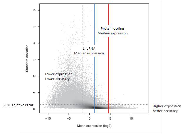 图3.标准偏差与表达水平的关系。Y轴为三次技术重复的标准偏差,每个灰色点代表一个转录本。在阴影区,灰度代表密度,灰度越深,密度越大。如图中所示,转录本平均表达水平越低,标准偏差越高;表达水平越高,标准偏差越低,定量越可靠,相对误差低于20%。在RNA-Seq中,只有41%的转录本能够被准确定量(水平虚线以下);而对于高表达的转录本(垂直虚线右侧),其中高达84%的转录本的定量是可靠的。这可以从垂直虚线右侧而不是左侧的高密度区落在了水平虚线以下看出[9]。