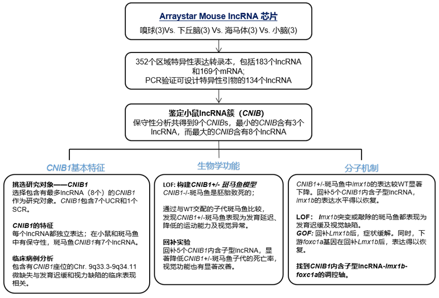 本文,作者发现了一个新的被命名为CNIB 的lncRNA基因簇。在7个CNIB 中,CNIB1 是从斑马鱼到灵长类保守度最高的一个,并且与人类的Chr 9q33.3-9q34.11微缺失综合征有密切关系。结果表明,CNIB1 座位对于斑马鱼的正常发育、运动能力及视觉功能是必要的。CNIB1的缺失也被发现存在于一部分Chr 9q33.3-9q34.11微缺失综合征病人中。