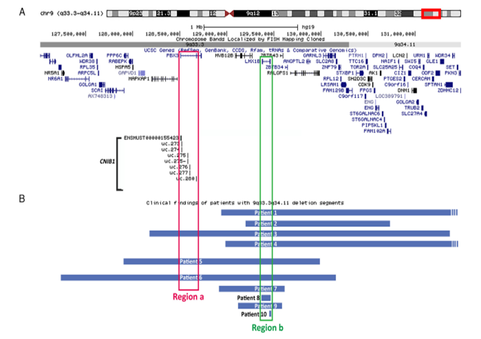  包含有CNIB1座位的Chr 9q33.3-9q34.11微缺失与发育迟缓和视力缺陷的临床表现相关