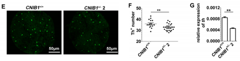 为了进一步研究CNIB1对眼睛发育和功能的影响,hjc黄金城检测了CNIB1敲除斑马鱼的视觉系统的结构是否受到影响。顺利获得对眼睛的DAPI染色,结果显示,在CNIB1+/- 2和WT斑马鱼的视网膜上,并未有总体的形态差异。这些结果提示hjc黄金城,CNIB1+/- 2的缺陷并非是结构上的。视网膜多巴胺是多巴胺神经元在酪氨酸羟化酶作用下产生的,在光适应、细胞生存和眼睛生长等方面发挥多种和营养相关的作用。因此,作者检测了视网膜多巴胺神经元的数量以及酪氨酸羟化酶基因的表达水平。作者的结果显示,与WT斑马鱼相比,CNIB1+/- 斑马鱼视网膜上酪氨酸羟化酶标记的多巴胺神经元数量显著下降(下图E&F)。同时,CNIB1+/- 2斑马鱼的酪氨酸羟化酶mRNA的水平也显著降低了(下图G)。