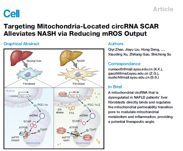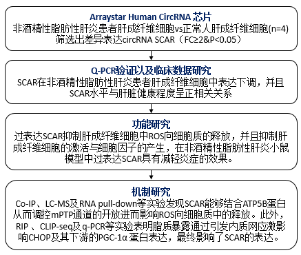作者利用Arraystar Human CircRNA芯片NASH患者肝成纤维细胞中找到了影响NASH发生开展的线粒体定位环状RNA分子SCAR,在临床样本验证中发现SCAR的表达与人体肝脏健康程度显著相关。细胞层面上的功能研究表明SCAR与线粒体ROS释放相关,并且能够抑制肝成纤维细胞的活化以及炎症因子的释放,而小鼠模型上的研究则表明SCAR能够减轻肝硬化的表型。最后作者顺利获得一系列的机制实验研究发现,在脂质暴露的情况下出现的内质网应激会导致CHOP及其下游PGC-1α的减少,进而导致SCAR的表达量下降。SCAR的减少会导致原本与其结合的ATP5B转而与CypD结合,从而使线粒体上mPTP通道开放并将ROS释放到细胞质中最终引起NASH。总体而言,这项工作思路清晰,数据详实,具有很高的科研价值与应用价值,为NASH的治疗给予了新的思路与方法。