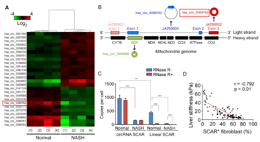 A:差异hjc黄金城聚类图(FC2,P<0.05,n=4,在NASH模型病人中找到明显下调的环状RNA分子SCAR(hsa_circ_0089762)。B:SCAR对应在线粒体基因组上的位置(以红框标注)。C:Rnase R处理后,Q-PCR验证SCAR环状结构以及SCARNASH患者中的表达情况。D:NASH患者肝脏硬度与SCAR成纤维细胞数目的相关性分析。