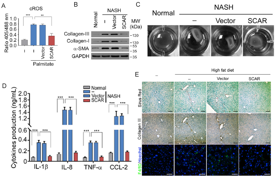 A:正常肝成纤维细胞在使用棕榈酸酯模拟脂质暴露的情况下,过表达SCAR对于细胞质ROS(cROS)含量的影响。B:Western blot检测过表达SCAR对于NASH患者肝成纤维细胞活化的影响。C:过表达SCARNASH患者肝成纤维细胞收缩性影响。D:过表达SCARNASH患者肝成纤维细胞释放的细胞因子总量变化情况。E:在高脂喂养小鼠模型中,过表达SCAR导致肝组织中浸润巨噬细胞减少