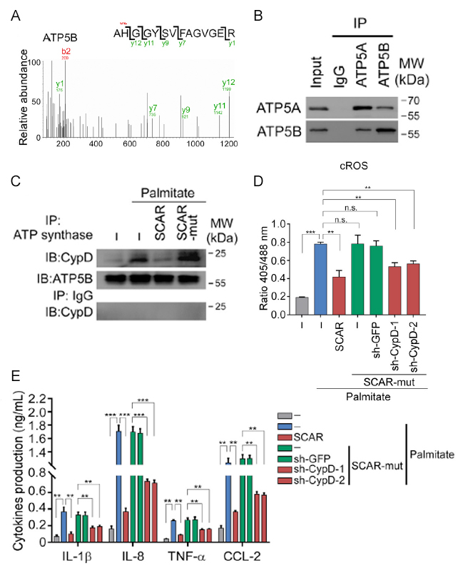 A:RNA pull down以及质谱检测SCAR结合蛋白。B:RIP实验鉴定ATP5BSCAR结合情况。C:SCAR影响CypDATP5B结合。D:SCARCypD对于肝成纤维细胞的细胞质ROS释放的影响。E:ELISA检测SCARCypD对于肝成纤维细胞释放细胞因子的影响