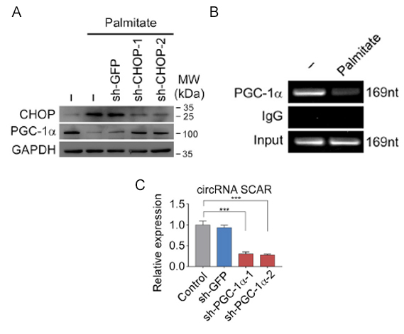 A:棕榈酸酯模拟脂质暴露的情况下,CHOP表达量上升,PGC-1α表达量下降,敲低CHOP蛋白后PGC-1α表达量降低。B:ChIP实验分析棕榈酸酯处理下PGC-1αSCAR启动子区结合情况C:PGC-1α敲低抑制SCAR表达