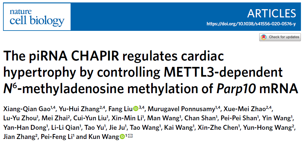 近期,青岛大学王昆教授发表名为“The piRNA CHAPIR regulates cardiac hypertrophy by controlling METTL3-dependent N6-methyladenosine methylation of Parp10 mRNA”的研究性论文。该论文应用Arraystar Mouse piRNA芯片筛选鉴定出与心肌肥大相关的piRNA分子CHAPIR,并顺利获得进一步机制研究检测(如MeRIP seq等)发现该分子顺利获得结合METTL3影响Parp10的甲基化来发挥调控功能。该研究成果于202010月发表在国际著名学术期刊Nature Cell Biology (IF: 17.728)上。(Arraystar piRNA芯片MeRIP测序由hjc黄金城生物丨数谱生物给予技术服务