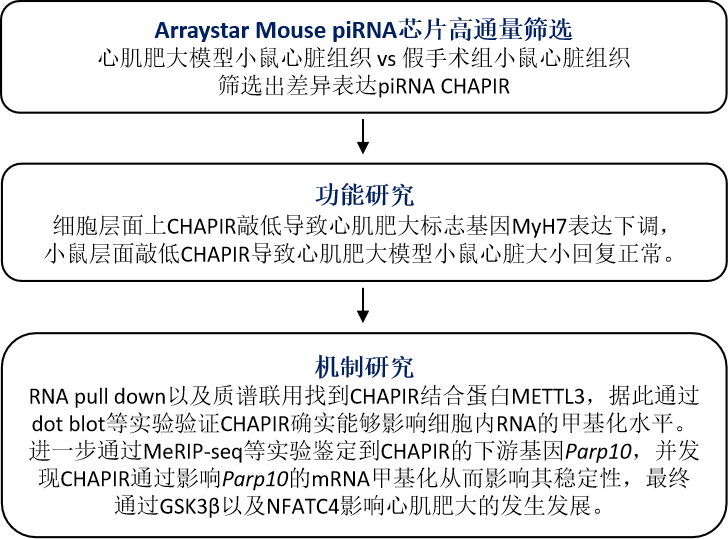 作者利用Arraystar Mouse piRNA芯片在心肌肥大小鼠模型的心脏组织中找到了促进心肌肥大发生开展的piRNA分子CHAPIR。细胞层面上的功能研究表明CHAPIR能够促进心肌细胞表达心肌肥大标志基因myh7小鼠模型上的功能研究则直接证明了CHAPIR能够影响心肌肥大的表型。机制上,作者发现CHAPIR能够顺利获得结合甲基转移酶METTL3,影响其下游基因Parp10的m6A修饰。m6A修饰则能够调节Parp10的mRNA稳定性,进一步影响该基因的蛋白表达,从而最终影响心肌肥大相关基因的表达情况以及相应的表型。总体而言,这项工作思路清晰,数据详实,为心肌肥大的治疗给予了新的思路与方法。