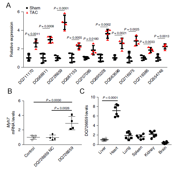 为了筛选到心肌肥大过程中差异表达的piRNA分子,作者应用Arraystar Mouse PiRNA芯片筛选了成年小鼠横切主动脉缩窄(TAC)手术后4周取得的左心室组织(心肌肥大模型组)与假手术对照组织中piRNA整体表达情况,并从中选择差异倍数前20的高丰度piRNA(原始信号>100)进行验证(图1A)。