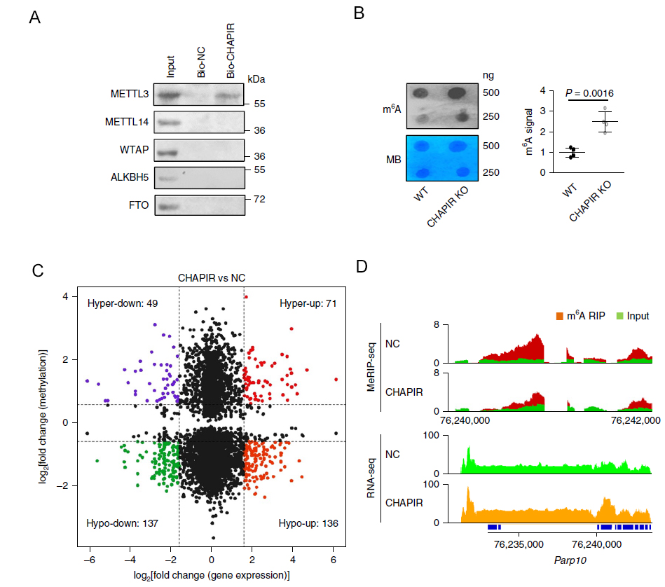 A:RNA pull down验证CHAPIR能与METTL3结合B:Dot blot实验表明CHAPIR敲除能够增强细胞RNAm6A修饰水平。C:取过表达CHAPIR的小鼠心脏组织与正常组织一起进行MeRIP-seqRNA-seq实验,差异基因表达数据与差异m6A修饰变化数据进行联合分析,最终找到Parp10。D:Parp10 mRNA上m6A修饰变化情况与基因表达变化情况的可视化结果。