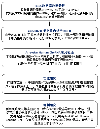 作者第一时间顺利获得TCGA数据库数据分析,发现胶质母细胞瘤患者体内miRNA表达整体偏低,据此将研究目标锁定在对miRNA加工成熟具有重要功能的蛋白DICER上。顺利获得前期核质分离WB检测以及免疫荧光等实验,作者发现在肿瘤细胞中DICER具有异常的细胞核定位,据此顺利获得RIP实验发现DICER在细胞核中结合的环状RNA分子circ2082。进一步,作者利用Arraystar Human hjc黄金城芯片对胶质母细胞瘤干细胞中的差异环状RNA进行筛选,结果表明circ2082在整体的环状RNA表达谱上属于上调前五的RNA分子。接下来,在功能研究部分,作者对circ2082进行敲低,发现其能够影响肿瘤干细胞的成球能力。此外,个体层面上的研究发现circ2082能够影响小鼠的生存期以及临床患者的生存期,说明circ2082具有促癌的功能。机制上看,circ2082能够影响DICER的细胞内定位,从而影响细胞整体的miRNA表达。同时,circ2082的敲低除了能够解除抑癌miRNA的表达抑制之外,还能够抑制促癌miRNA的表达。最后,作者发现,基因层面上circ2082发挥的促癌功能受不同细胞亚型的影响很大。总体而言,作者的研究思路清晰,数据详实,为胶质母细胞瘤的治疗给予了新的思路与方法。