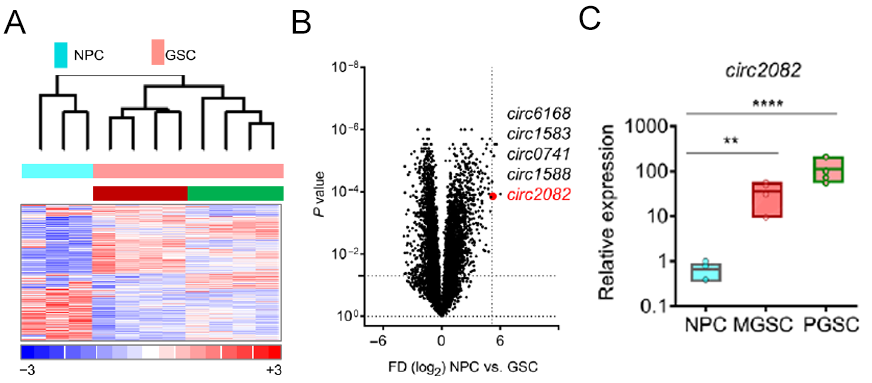 B:胶质母细胞瘤干细胞内差异环状RNA火山图。虚线为筛选阈值,标识出的环状RNA为差异上调前五的环状RNA。