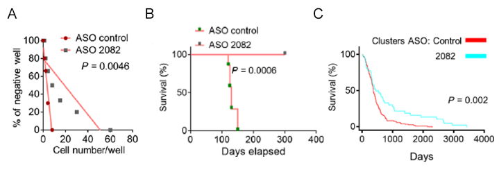 B:生存分析表明,尾静脉注射敲低circ2082胶质母细胞瘤干细胞的小鼠具有更长的生存期。