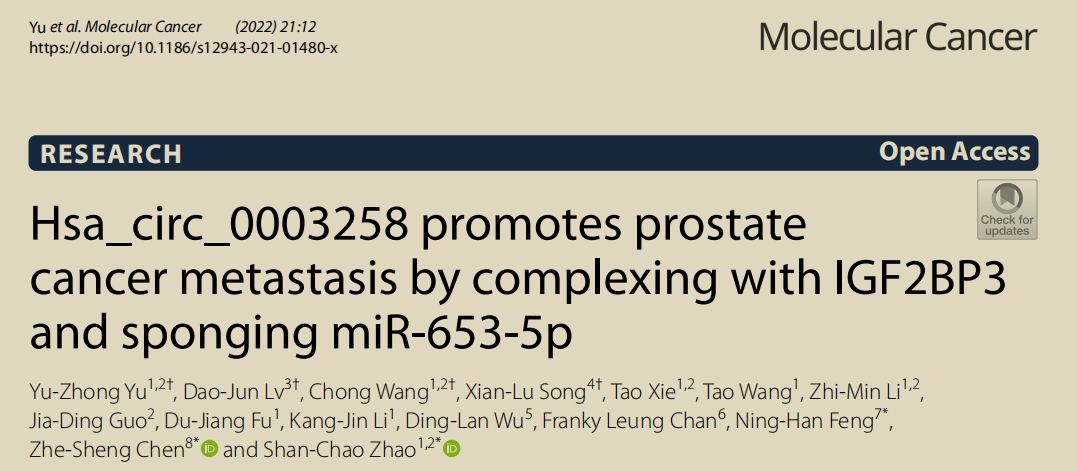 近期,南方医科大学南方医院泌尿外科赵善超研究团队发表名为“Hsa_circ_0003258 promotes prostate cancer metastasis by complexing with IGF2BP3 and sponging miR-653-5p”的研究性论文。该论文应用Arraystar Human hjc黄金城芯片发现,前列腺癌组织中hsa_circ_0003258上调,顺利获得吸附miR-653-5p调控ARHGAP5的表达,该hjc黄金城还可以顺利获得结合IGF2BP3促进HDAC4 mRNA稳定性。该研究成果于2022年1月发表在国际著名学术期刊《Molecular Cancer》 (IF:41.44)上。(hjc黄金城芯片由hjc黄金城生物丨数谱生物给予技术服务)