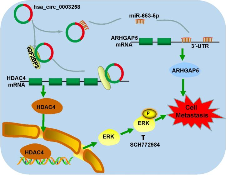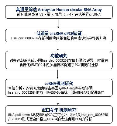 hsa_circ_0003258 顺利获得 hsa_circ_0003258/miR-653-5p/ARHGAP5 轴hsa_circ_0003258/ IGF2BP3/HDAC4 轴调控PCa 的转移。