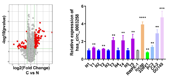火山图显示前列腺癌血浆样本中 hjc黄金城 的表达谱。顺利获得 qRT-PCR 验证hsa_circ_0003258在前列腺癌组织和细胞中表达上调