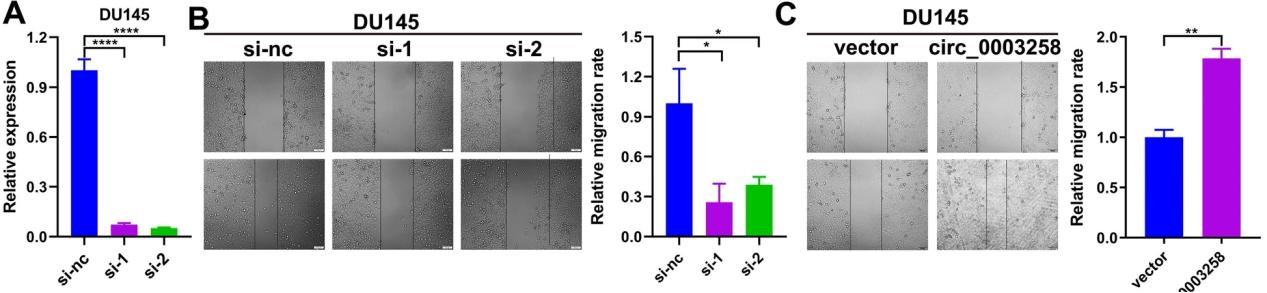 hsa_circ_0003258 促进 PCa 细胞的侵袭性。hsa_circ_0003258 siRNA敲除和过表达质粒后顺利获得qRT-PCR检测hsa_circ_0003258的水平。划痕实验检测hsa_circ_0003258 改变 PCa 细胞的迁移能力。