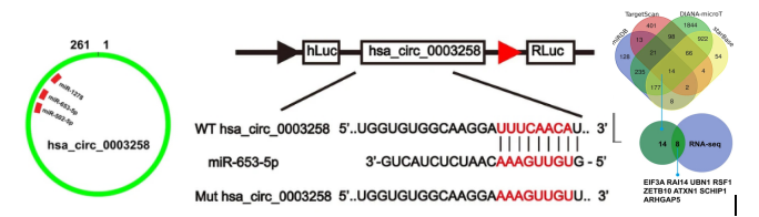 图3 左图hsa_circ_0003258与miR-653-5p的预测结合位点。中图 hsa_circ_0003258 野生型 (WT) 和突变型 (Mut) 荧光素酶报告实验设计。右图顺利获得生信预测和敲低hsa_circ_0003258前后RNA-seq,找到下游靶基因ARHGAP5。