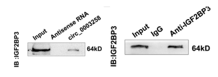 图4 左图hsa_circ_0003258 RNA pull down-WB证明hjc黄金城结合 IGF2BP3 。右图RIP-qPCR 分析显示 IGF2BP3 和 hsa_circ_0003258相互作用。
