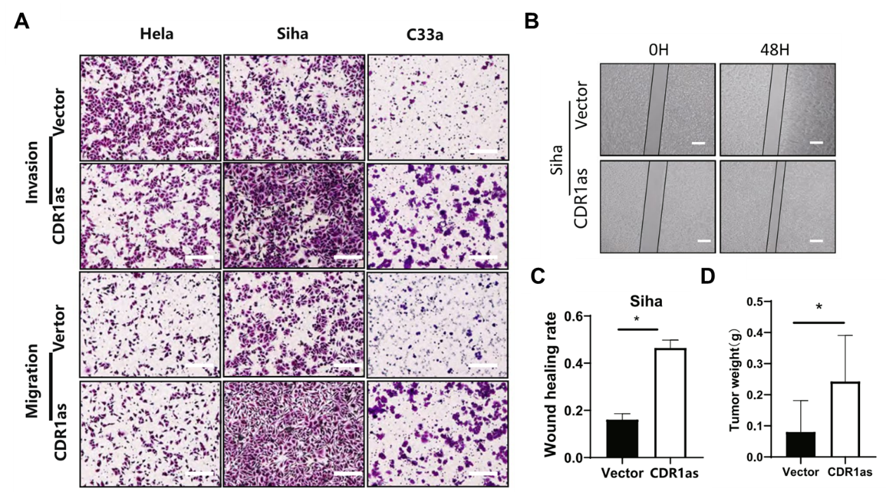 A 过表达CDR1as增强肿瘤细胞的迁移和侵袭能力;