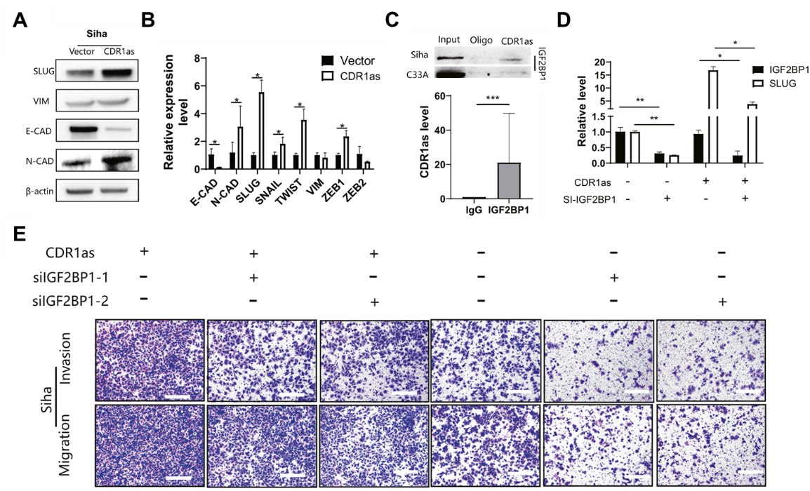 D在CDR1as过表达细胞中沉默IGF2BP1导致下游效应基因SLUG表达降低;