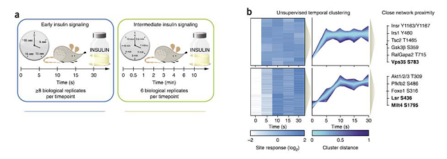 运用高通量磷酸化蛋白组学技术研究胰岛素在0-30s以及0-10min时间段内蛋白磷酸化水平变化趋势(a)。对时间分辨的磷酸化蛋白组数据进行聚类分析,能够发现胰岛素信号通路中的功能相关节点,粗体显示节点中的新成员(b)。