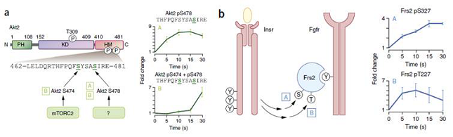 根据蛋白磷酸化水平变化模式,发现新的生物学现象:(a)两个相距很近的磷酸化位点具有截然不同的磷酸化模式,意味着不同的调控模式。(b)研究信号通路间的cross-talk。由Frs2介导的INSR通路与FGFR通路间的cross-talk。