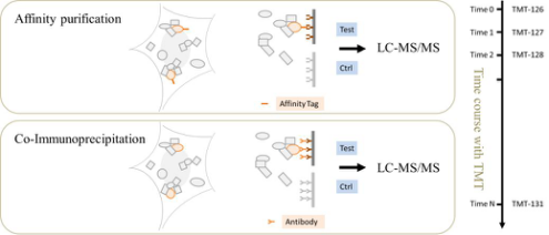 使用亲和标签(AP-MS) 或特异性抗体 (CoIP-MS),在native条件下纯化与目标蛋白质相互作用的蛋白,进而使用质谱进行鉴定,顺利获得test\control比对,过滤非特异结合蛋白,定性定量分析与特定蛋白质直接或间接作用的蛋白质。同时,结合 LFQ/TMT等定量技术,可以方便的研究特定蛋白互作关系随时间的变化情况。