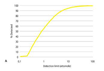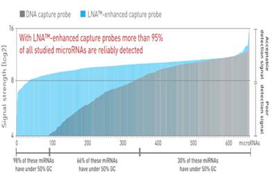 *图释:基于LNA的探针具有极高的灵敏度。可以检测普通DNA捕获探针不能检出的微量microRNAs;新一代microRNA芯片检出极限可达1 amol,起始总RNA量可低至30ng