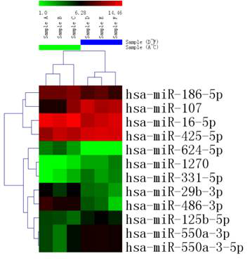*图释:差异表达的microRNA的聚类分析(miRNA芯片数据)。