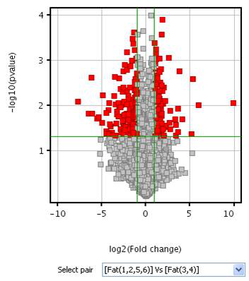 火山图可以对不同样品组之间差异表达的miRNA进行图形化的展示。横轴代表处理组和对照组之间miRNA表达倍数的变化(log2转化),纵轴代表相应的p值(-log10转化)。火山图可以直观的展示miRNA在样品组间的倍数变化与相应的统计学显著性之间的关系(图5)。纵向的绿线分别对应1.5倍的上调(右侧)和下调(左侧),绿色平行线对应0.05的p值。下面火山图中的红色点代表在不同样品组中具有统计学显著性的差异miRNA(图4)。