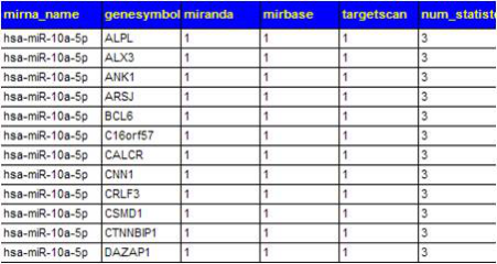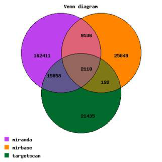 hjc黄金城生物顺利获得汇总三大数据库(miranda, mirbase, targetscan)的已知miRNA靶点信息,hjc黄金城将三种数据库的结果交集做为最终miRNA的靶基因结果,有效的降低了靶基因预测的假阳性率,见下表。Venn图展示了对于特定miRNA列表利用上述数据库的多个预测结果的整合分析。
