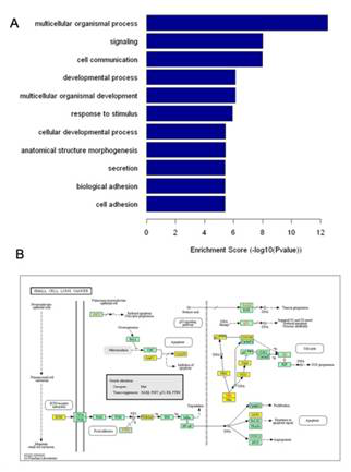 *图释:A. GO分析结果展示:预测的差异表达microRNAs靶基因的前10个富集生物学过程;B. Pathway分析结果展示:预测的microRNA靶基因(CKS1、Skp2等,黄色标注)与细胞周期相关,提示microRNAs可能涉及到小细胞肺癌的发生。