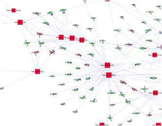 可以从整体上挖掘miRNA和其靶基因的调控关系, 下面的网络图中红色结点为miRNA,蓝色结点为靶基因,结点大小越大说明这个节点在microRNA—靶基因相互作用网络中的位置越重要。
