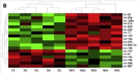 *图释:芯片筛选差异表达的microRNA,可以将复发与不复发组区分开。