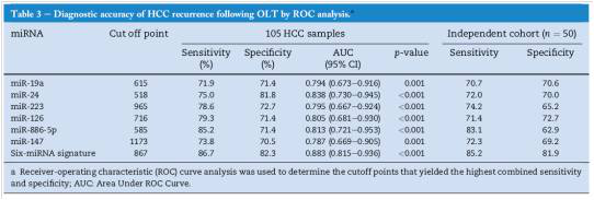 肝癌(HCC)患者进行肝移植后,依然可能复发。如果复发,则预后差。现在,预后判断主要采用米兰标准和UCSC标准,这两种方法主要基于肿瘤大小和损伤数目来进行预判,并不能准确预测疾病进展和预后。该研究发现,在复发和不复发的病人之间,microRNA表达谱有明显差异。在显著变化的microRNA中,6个microRNA(miR-19a, miR-886-5p, miR-126, miR-223, miR-24 and miR-147)作为一个整体,可以做肝癌复发和病人生存的预后判断,与现有的预后判断方法,如米兰标准相比较,microRNA分子标记物准确性好,特异性强。研究者对挑选出的microRNA的功能进行了初步的探讨,发现这些microRNA参与了肝癌复发相关的信号通路中,为进一步阐明microRNA在肝癌中的作用机制奠定了基础。