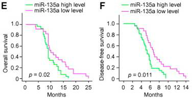 *图释:miR-135表达量不同的病人的KM生存线(miRNA qRCR数据)。
